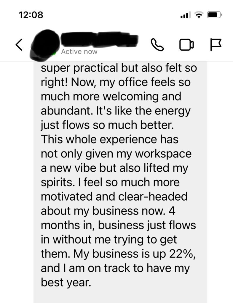 Her adjustments didn’t require any renovation of her current space, we moved her office into one of her guest rooms. In about 4 months, her business is up 22%, and by the end of the year, she recorded 25% more revenue than previous years (best recorded revenue out of the 6 years she’s been in business, especially during a global economic downturn). Below you’ll find her testimonial.