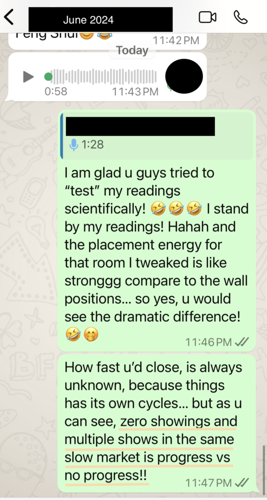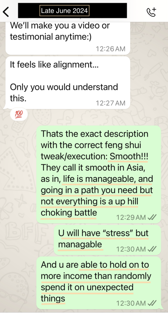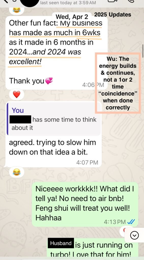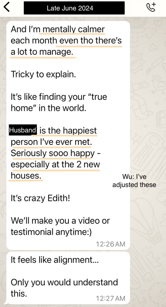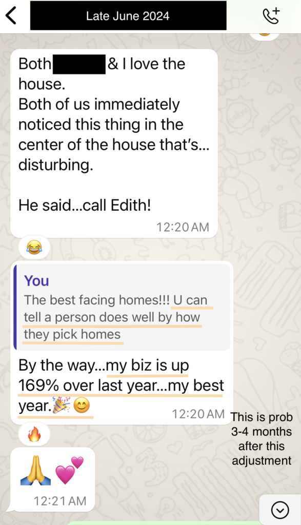 Timing on “prosperity”: I can’t stress this enough, you don’t get to choose “how fast” or see “how it ends” in an instant. You need to let the plot run for a while to collect enough data. Your intentions and where you are in life is also important. Are you already on your right track or are you still navigating or finding your paths? Some people will experience certain things faster than others but how much “money” a person can make also depends on their birth charts. Feng Shui just helps “fuel/smooth out” your prosperity the best ways it knows how. Notice the client, like many others mentioned about being “calm” while having to juggle a lot. There are more official ways to do their A/B testing if they really want, but luckily they see the results they need fast enough to know the difference between the positions (Position 1: Whatever they want vs. Position 2: What Edith said to do). The house found the right buyer in early 2025 (it took a while, as expected for reasons disclosed in her session) but without the boost from feng shui, the house would sit in the market for an even longer amount of time.