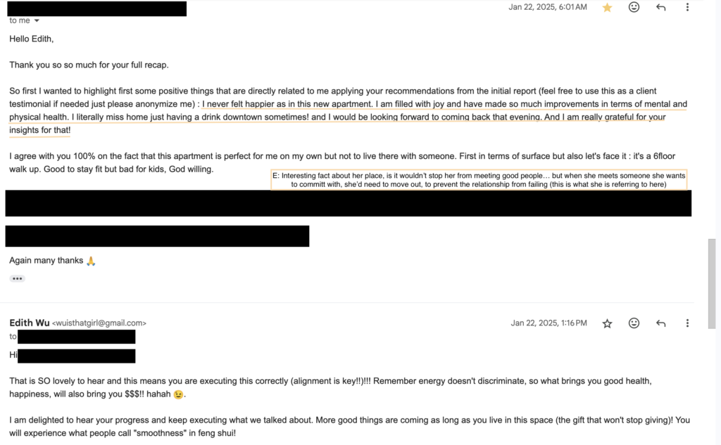 This client came to me while her apt was being renovated in late 2023. It seemed like she wanted to start off her new chapter in life strong, after going through some rough patches in her personal life. In Jan 2025, she sent me an update about what she’s been experiencing after she followed my feng shui adjustments.