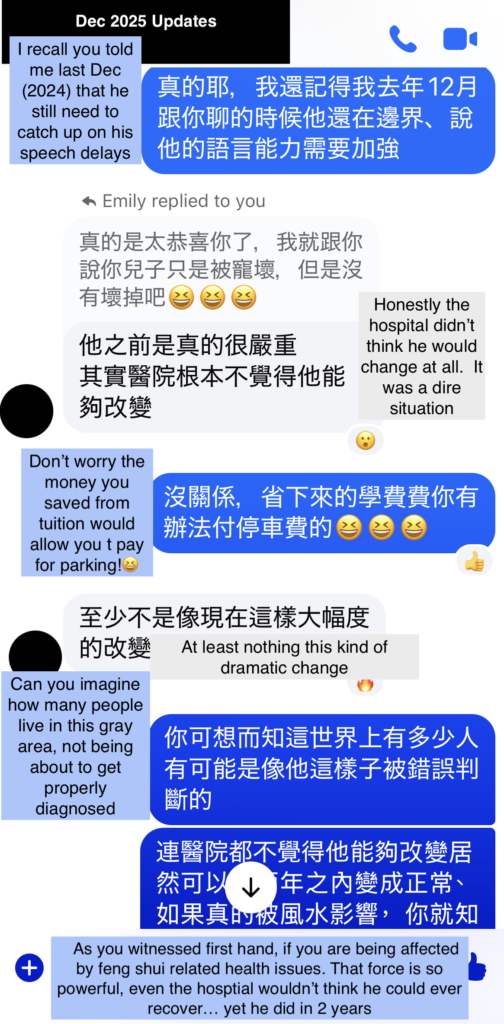 She also mentioned, her son used to spin around when you put him down to sleep, but since the adjustments, he prefers to sleep only in the good feng shui beds, and the spinning would stop when he sleeps in the adjusted beds. Even the examiner at the hospital was shocked at his new results the 2nd time they met because most kids don’t improve dramatically within this kind of time frame. This family continues to thrive harmoniously since, and our relationship expands into other ventures in her life .