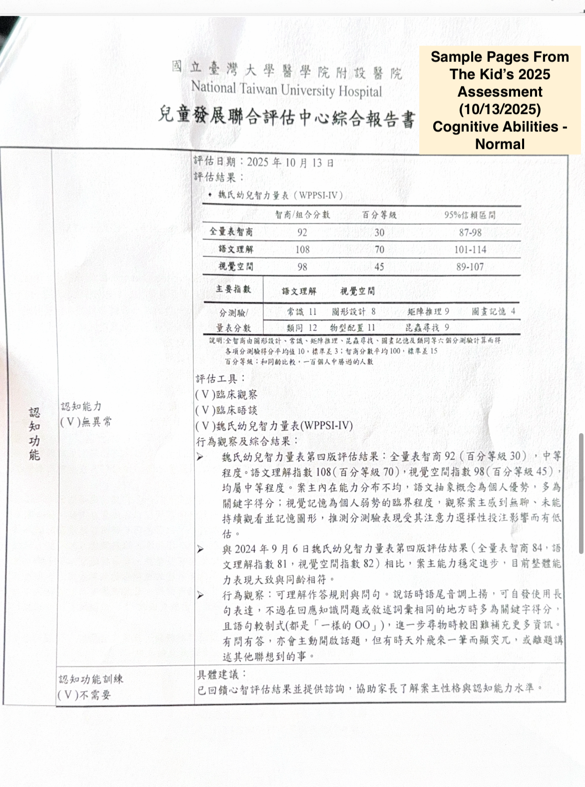 Because she is a family friend, and there were skeptics even within our circle, when this report came out, a few mentioned that because she spent a lot of money/energy on her son’s special education, so naturally his FSIQ should improve “THIS significantly” over a short period of time. Because I was curious, I asked: