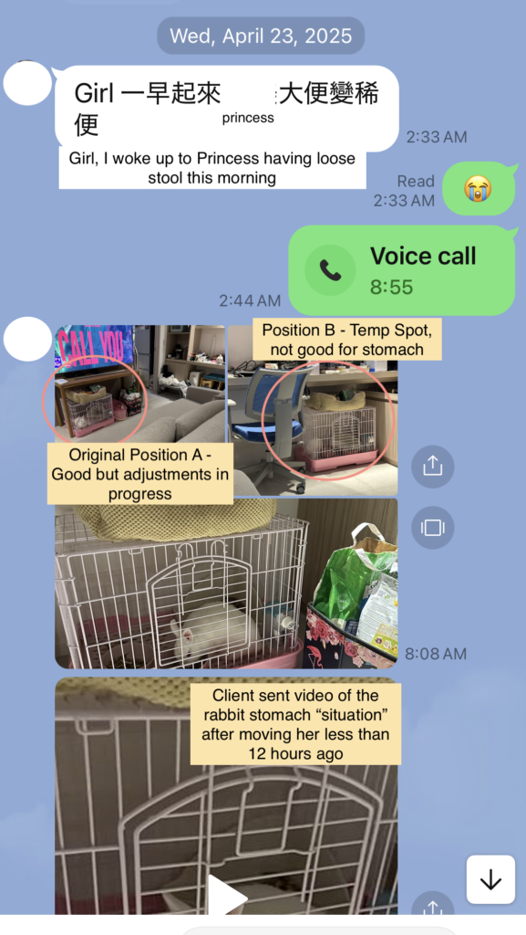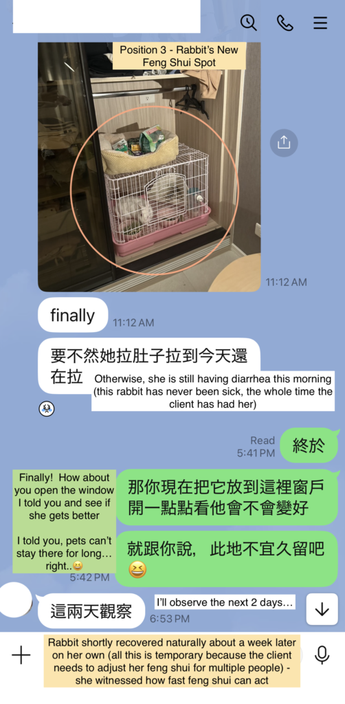 During the adjustment of this client’s home, the rabbit had to be temporarily placed in the wrong spot as things were getting moved. I mentioned the rabbit should not be in the wrong spot for long (less than 1 week max), or else it would have stomach problems. Sure enough, the rabbit started to have diarrhea the next day (that is how fast many animals can react to feng shui energies). I have feng shu’ed another dog that’s exactly like that. Because the owners knew about the symptoms to look for prior, we moved the animals to the correct spot immediately. The stomach issue in both cases resolved itself within a few days naturally.