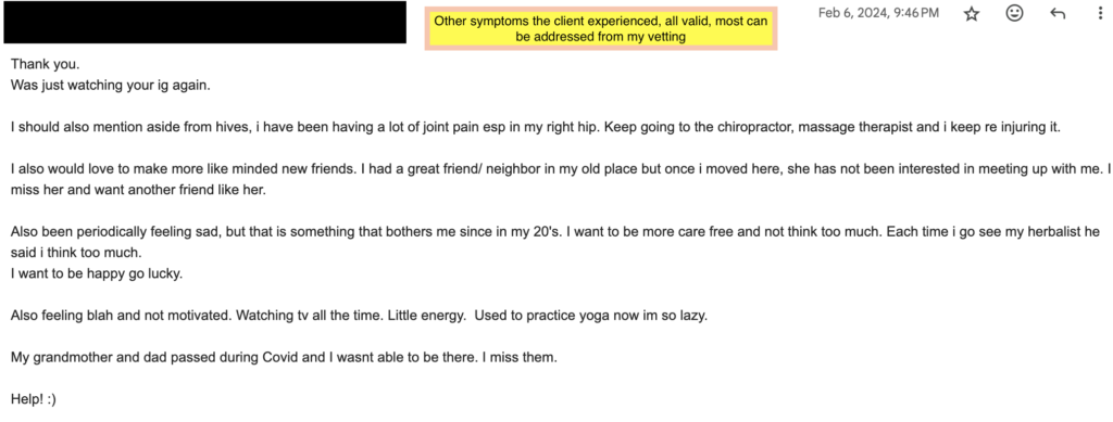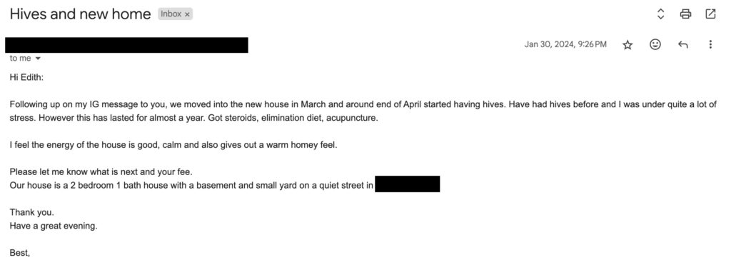 Jan 2024 – Client has a dog walking business, saw my IG post, experienced skin issues and other symptoms that weren’t present before living in her home. She’s seen the doctors and tried many remedies to no significant improvements. She’s never done real feng shui reading before and initially thought my pricing was “expensive”. Little did she know her reading would become the gift that won’t stop giving!