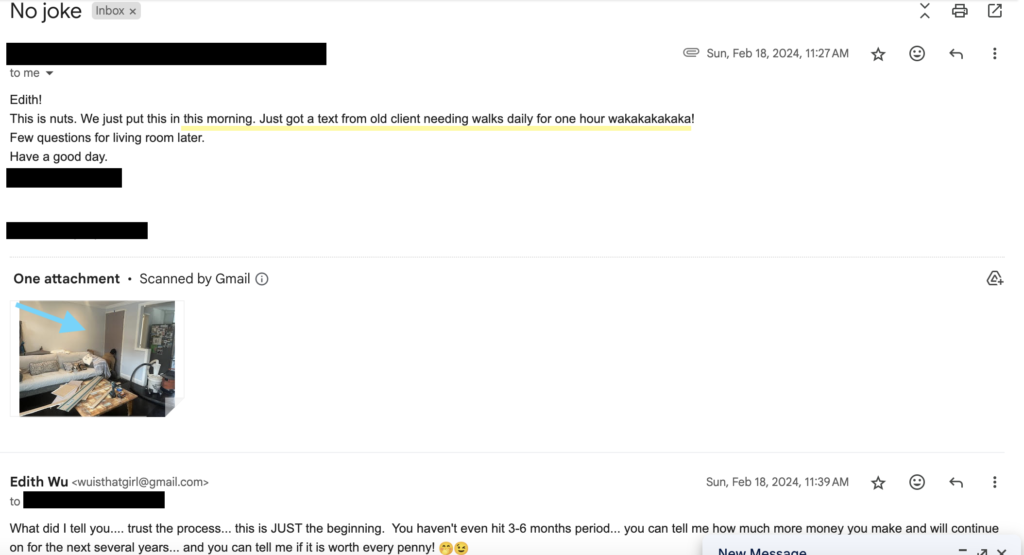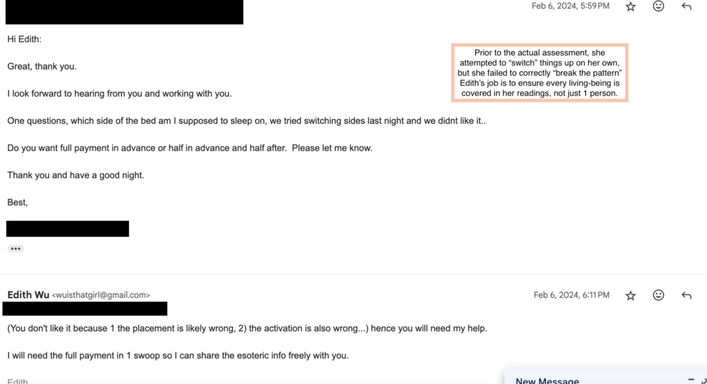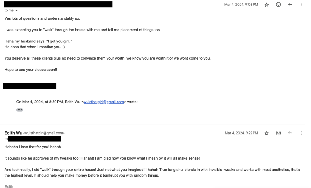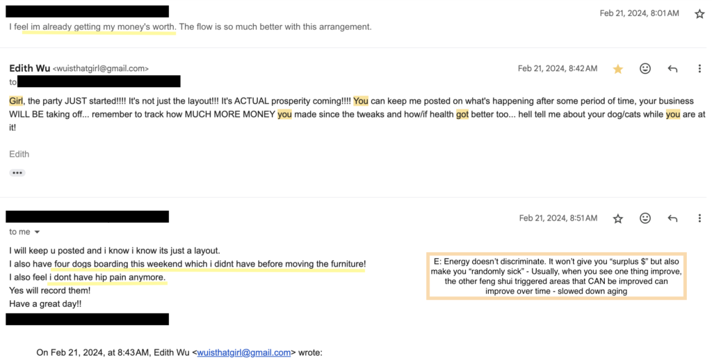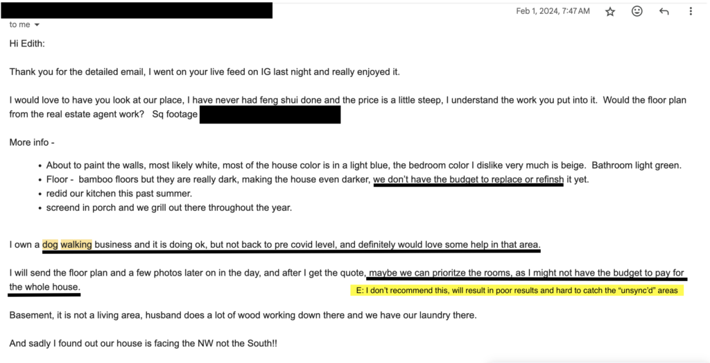 Pricing: For the virtual consultations, the pricing is designed to be fair, scaled, and standardized to compensate for the amount of time it’s needed to collect, strategize and map out these custom adjustments. It’s designed so that the people who may need the help, can have a chance to get a reading (even though it is labor intensive on my end as I plan each one of these out meticulously prior to getting on the call, and there are only limited sessions available per week). This is the reason why bookings can’t be done the day of and why we vet all of our clients/readings to ensure I can be as helpful as possible and the clients understand what they are walking into. If it is an adjustment that will have complications or low feng shui score, Edith will find a way to communicate that prior, so the clients can still get some form of understanding or clarity (We aim to provide transformative services, life is too short to be mediocre) . This client definitely made her money back within 2 weeks of adjustment and putting up that “wall”. She will not need to come back for repeated readings of the same home, the energy should last her until her “next move”. The improved happiness, better business opportunities, improved health = priceless.