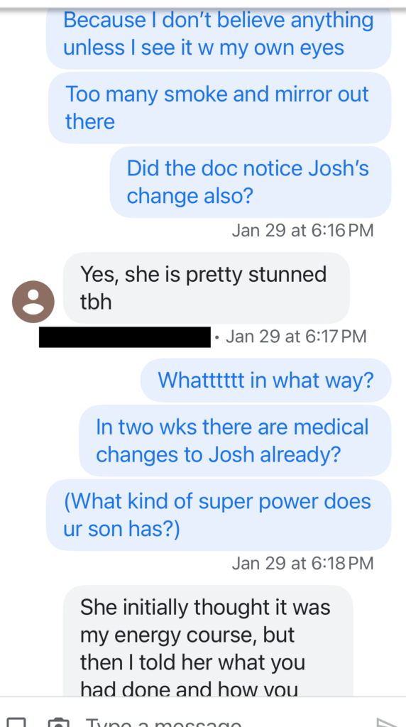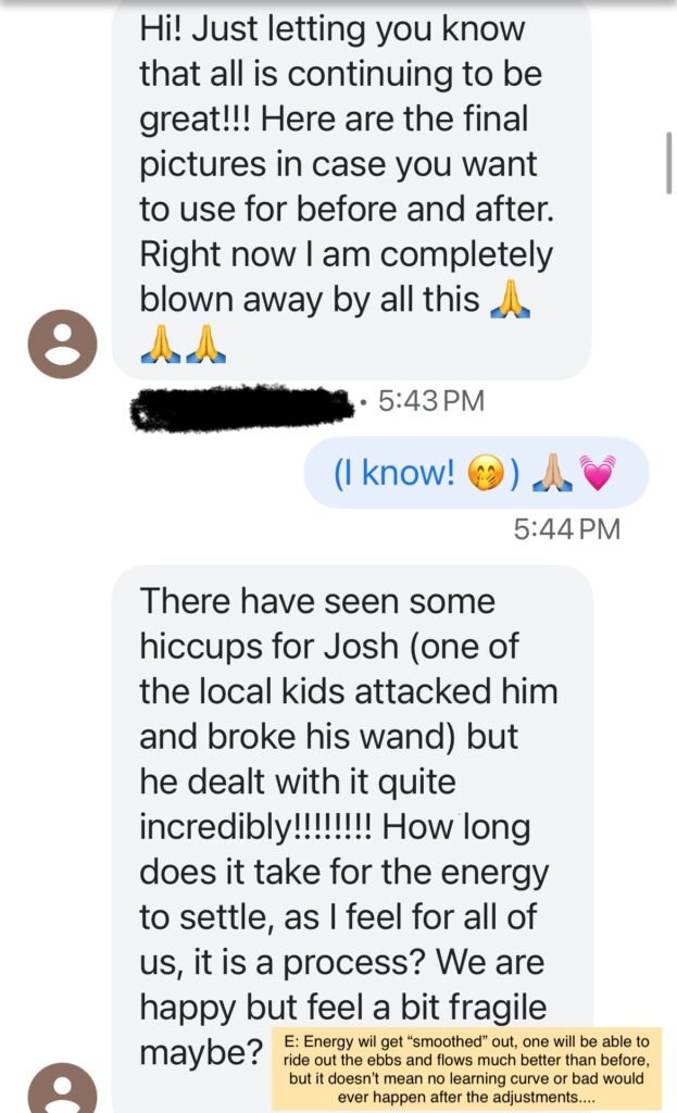 Sure enough, the mom felt a major difference in 48 hours with how her son’s mood and sleep immediately improved, less outbursts.  A few weeks later, the doctor they go to notice the improvement with her son as well.  He is later on able to focus for a prolonged period of time studying, going to school, and making new friends.  They continue to have sustained improvements months after the adjustment.  As a result, she is able to experience improvements with her health and prosperity.