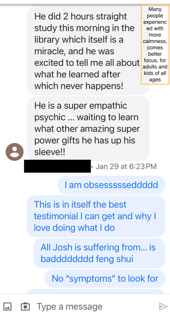 I first told the mom to switch to a new bed position, test out the new spots, and be prepared to re-learn about her son’s true personality (his outburst, easily triggered personality is not who he really is, it’s a combination symptom from bad feng shui).