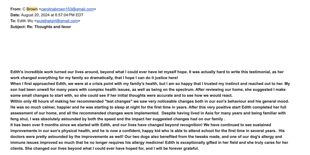 When I vetted her case, I could tell the son was extremely unwell (floor plan, set up, and compass), especially when her son has special intuitions, bad feng shui will impact him more quickly and feels more severe than normal people (who take more time to “feel a change”).  His situations can be improved with feng shui but needed a few out of the box ideas to resolve most of the issues in this family.