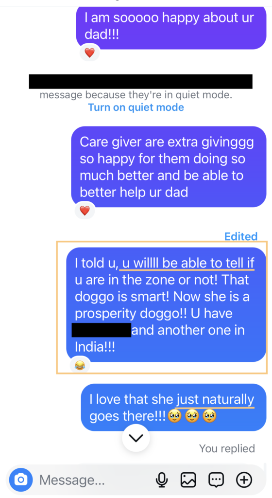 Miraculously, she saw some improvements with her dad’s situation within 48 hours. Even the stray dog that her dad has been feeding immediately located the prosperity spots the same day the adjustments had been made!