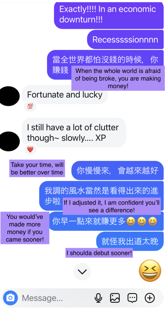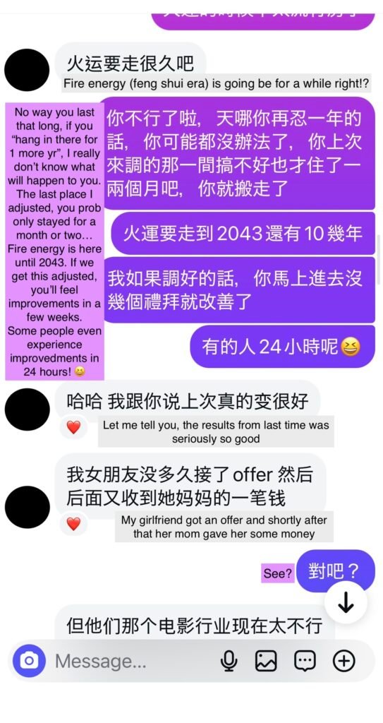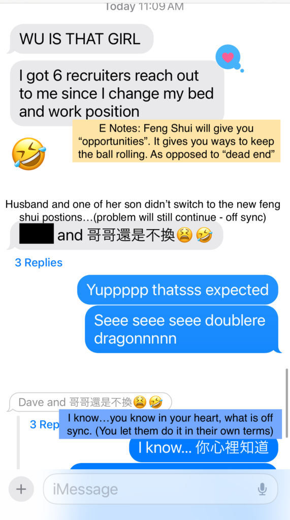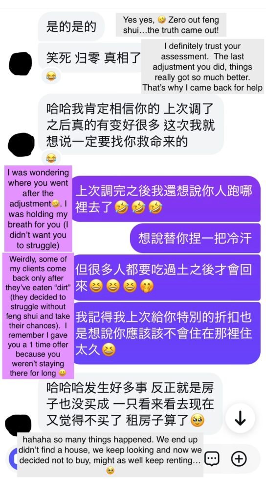 This client has a reading/consulting business. His initial feng shui score pre-adjustment was about 10 points… out of 100. Post adjustment is about 85 points+ (out of 100), a significant improvement from where he started. Shortly after implementing the feng shui adjustments, he was able to get new bookings for his services. All great signs from many of my clients. To me, these are just initial signs that the implementations are correct, peak between 3-6 months. The abundance of energy doesn’t stop with “1 coincidence” or a handful – when you implement things correctly, it keeps going for many years to come.