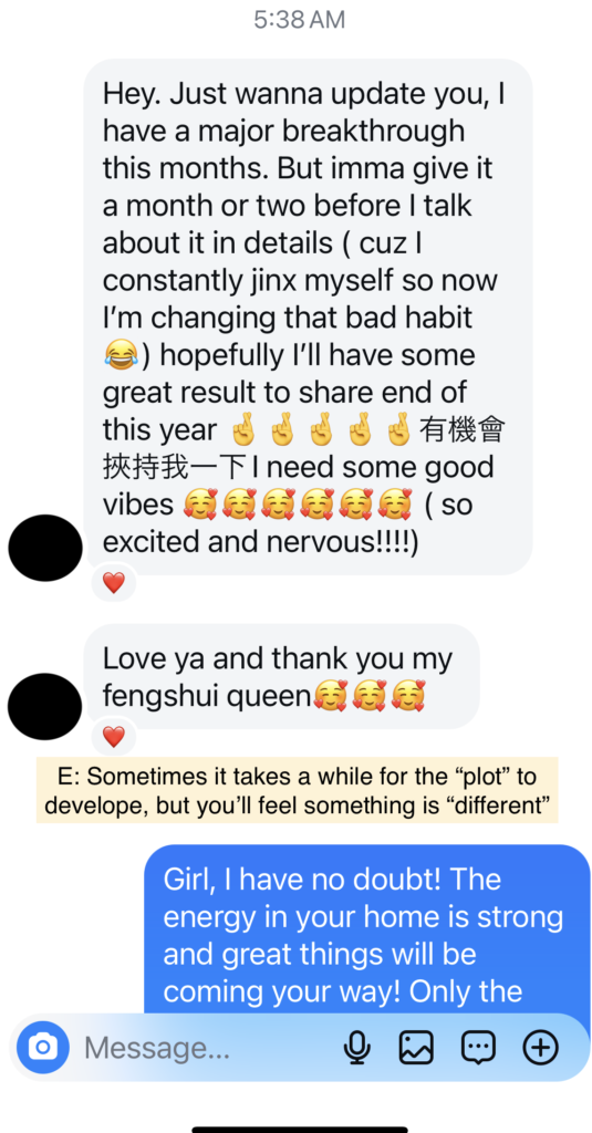 Not everyone who comes to feng shui is immediately on the right path to make money. When you are on the right path, the Universe will let you. If you need to course correct, or thicken your plot in your own journey, the Universe will present that to you as well. Sometimes I get updates like these, new things are brewing, results to come later.