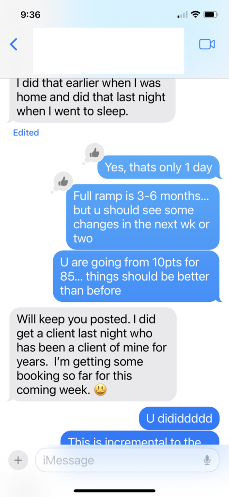 I get updates and random bits and pieces from clients from time to time. Not every client is tracked in great details like the ones you saw in previous testimonials. Some came back to share their excitement with me, some have other extended projects for me from this one experience. While the testimonials below are not as “in depth” it shows the ranges of transformations and what people have observed post my consultations.