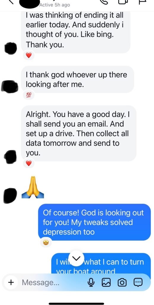 July 2024 – I received a DM from a follower who was living through a series of unfortunate events that piled up on her. She felt as though things were going so badly, there wasn’t any reason for her to live on (her DM below). In her last attempt to survive, somehow she thought of messaging me to see if I can help her. The truth is, after learning about her situation, I sensed that she was not “truly depressed” as she interpreted it (while her feelings were true, and valid). Her situations can be addressed and are fixable. She was mostly depressed because she worked hard but opportunities and money were not coming her way. Knowing deep down she is good at what she does and has an unique approach to her work – she was exhausted, burnt out and didn’t know what’s the purpose of life, if nothing seems to make an impact for her work.