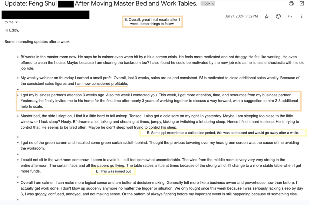 Some of her feng shui symptoms she experienced during this time were – lack of harmony, she fought with her partner a lot, easier triggered (on both sides), lack of monetary gains/opportunities, despite being a very talented creative reader, feeling isolated/bullied (this was the main cause of why she felt what she felt, and is the part that’s addressable via feng shui when addressed precisely).