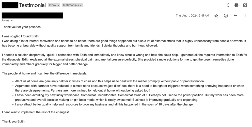 It turned out I was accurate with my assessment, her testimonial/transformation email below. Even though her transitions were coming in in phases, she felt immediate change and improvements with things within a week. She is hopeful, happy, no longer suicidal, and continues to do well since then.