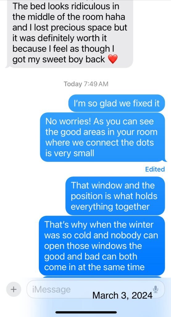 Client had their reading in 2023, she expressed her son recently developed some intense behavioral issues and OCD like tendencies that required him to seek professional assessment. This happened shortly after the couple had to reconfigure their room because they had a new baby. I suspected that it has to do with the bed placement and in order to correct this issue in a small room, the couple would need to pull the son’s bed away from the wall by 5-6 inches (because the window on the floor plan is off by several inches to align with the correct placement). This reality was a “hard pill” for the couple to accept initially because they will be losing more space in an already tight fit room so they didn’t take action on this and chose to see if therapy can improve her son’s conditions.