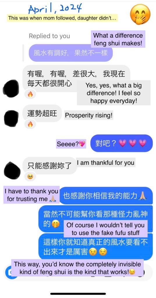 The client in this case study is someone I know. This tells you that the techniques I use are not only applied to myself, but to my friends and family (and of course my clients). The thing about adjusting your friends and family for a feng shui master is that, you really need to have what it takes, or else the master is self sabotaging his/her social circle if the accuracy is “low”. There are many other reasons why an adjustment would not be as significant in the FAQ. However, the main goal for me is to provide a service for clients at a much higher rate of accuracy than what’s offered in the market. That’s why I am sharing these detailed testimonials from my clients who update me with their results/observations over time because I know their stories will reach the people who need to see them.