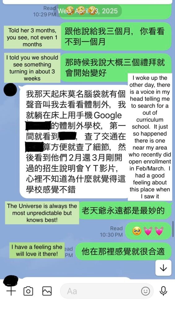 About 3 weeks later, the mom had a light bulb moment, miraculously found the perfect school near their home that somehow recently had an orientation. She took her to try out the school and things worked out perfectly – she loved the school, the teachers and classmates like her. [If the daughter didn’t adjust her position, and blindly switched to another school out of desperation, she’d have a high likelihood of “just my luck” to land another school where she doesn’t fit in and the lack of synchronicity would continue]. Pretty immediately, shortly after she switched school all the symptoms of depression went away. Since she switched schools in April 2025, she started to do well. In September 2025, I received news that she is top of her class and she continues to do well in her new school with new friends who love her.