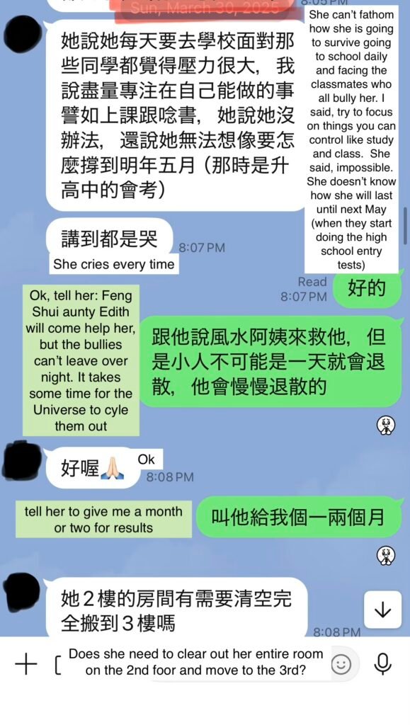 At the time only the client (mom) was following my suggestions consistently, but the daughter was not a believer of my feng shui – she didn’t follow anything I recommended. She called her mom “supersticious”. Because I am not allowed to intercept anyone’s journey nor force anyone to believe in anything… I nicely said to her “you can do what you wish, just under 1 condition…if you start to get bullied badly, you will need to switch to a new room upstairs.” (I said this because esoterically, her bedroom was built with a high likelihood of people being bullied …It’s the kind where you can’t shake it off until you change the pattern, as in, no matter how you change your social circle, the isolation/bullied tendencies follow you around).