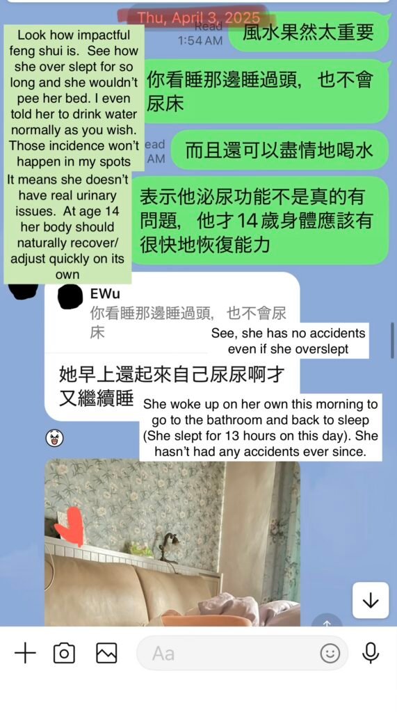 While most people would accept their fate and let the madness go on for years, (because they don’t know of any ways to solve the issue at its core and much damage could already be done), the clients in this case came to resolve the issue only 2 months after things happened. Because of this, I had a feeling they could see strong results in a much shorter time frame than people who waited too long. All they needed to do was execute the bed placements correctly and make sure the new flow in this home is correct and wait for 3-4 weeks and see. I also told the daughter to ignore the 8:30PM no water rule, because it should get better after a while because her incontinence was triggered by feng shui, not a natural part of her “aging”.